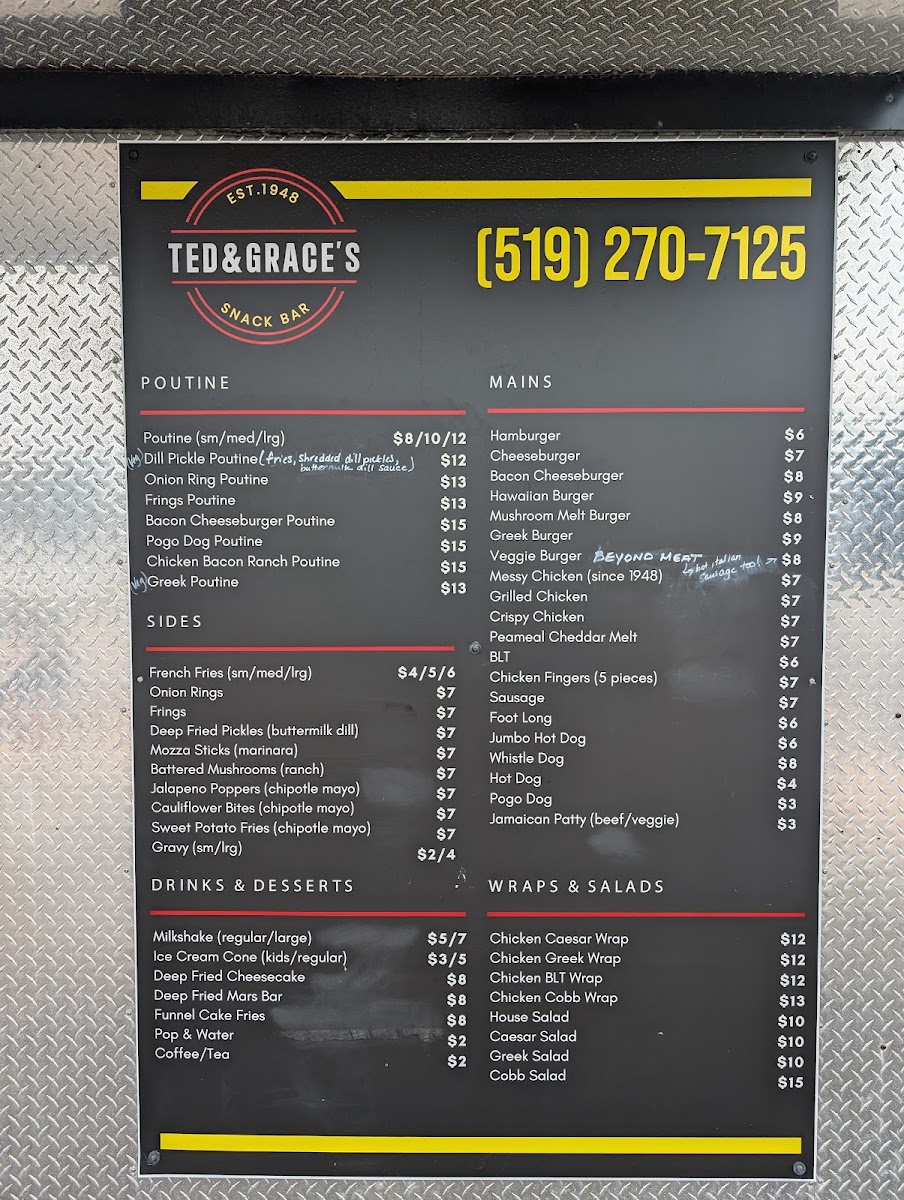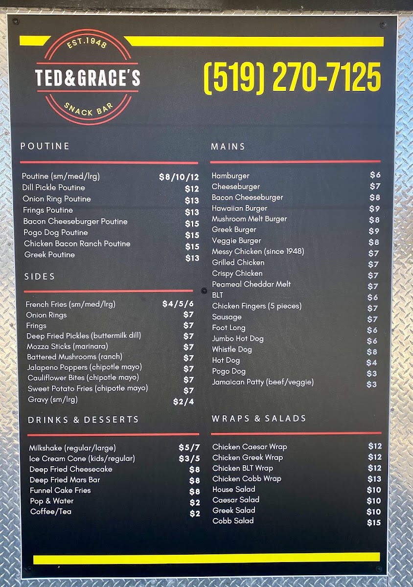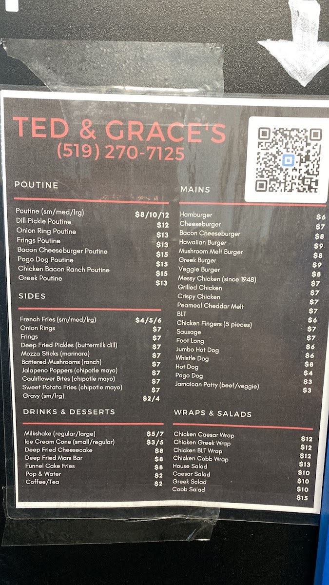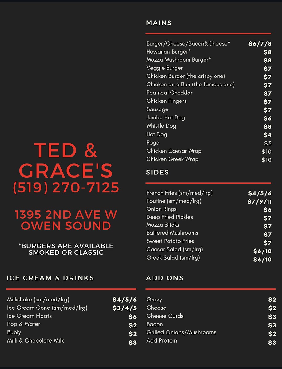 Welcome to Ted & Grace’s, a delightful culinary gem located in the heart of Owen Sound, ON. Known for its friendly atmosphere and exceptional service, this charming eatery specializes in delicious takeout options that appeal to all ages. The menu features a variety of mouthwatering choices, with highlights including the bacon cheeseburger and crispy chicken sandwich, both crafted with fresh ingredients that tickle the taste buds.